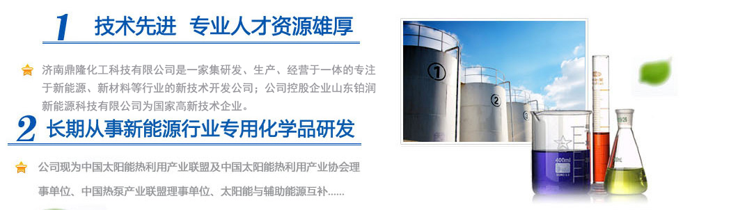 濟南鼎隆化工科技有限公司是一家集研發(fā)、生產(chǎn)、經(jīng)營于一體的專注于新能源、新材料等行業(yè)的新技術開發(fā)公司;公司控股企業(yè)山東鉑潤新能源科技有限公司為國家高新技術企業(yè)。擁有雄厚的科研實力和專業(yè)銷售隊伍以及多名從事化學化工專業(yè)的高素質人員,其中博士生導師1人,碩士研究生3人。公司現(xiàn)為中國太陽能熱利用產(chǎn)業(yè)聯(lián)盟及中國太陽能熱利用產(chǎn)業(yè)協(xié)會理事單位、中國熱泵產(chǎn)業(yè)聯(lián)盟理事單位、山東清潔能源供暖產(chǎn)業(yè)聯(lián)盟理事單位、太陽能與輔助能源互補供熱/制冷工程專業(yè)委員會會員單位。公司專注于綠色科技,專業(yè)化研發(fā)環(huán)境友好型化工產(chǎn)品,與眾多高校和國內(nèi)外多家著名化學品公司保持戰(zhàn)略合作關系。公司擁有“載能”和“澤能”...更多